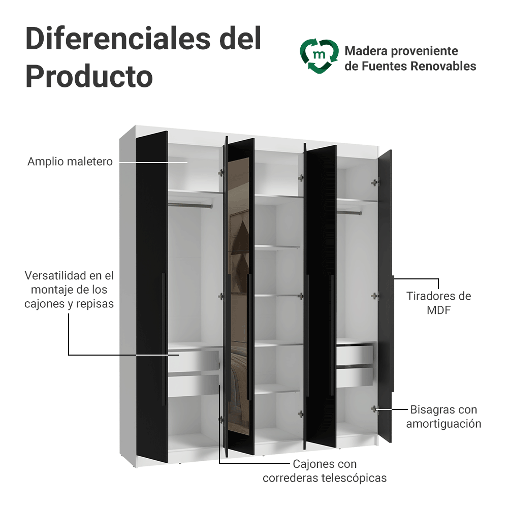 Clóset Matrimonial Venus 6 Puertas Batientes con Espejo Blanco/Negro/Negro