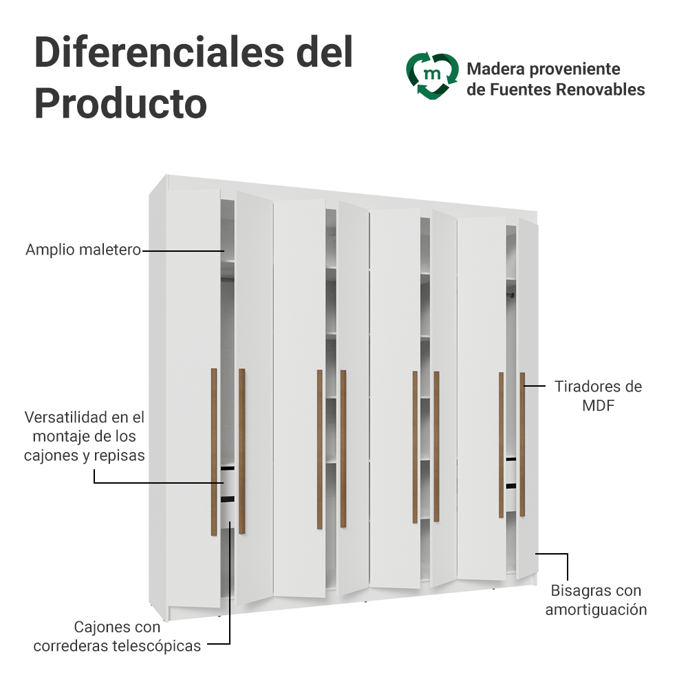 Esta combinación de elementos hace del clóset Venus 8 puertas la elección ideal para quienes buscan un mueble funcional, con detalles que marcan la diferencia.