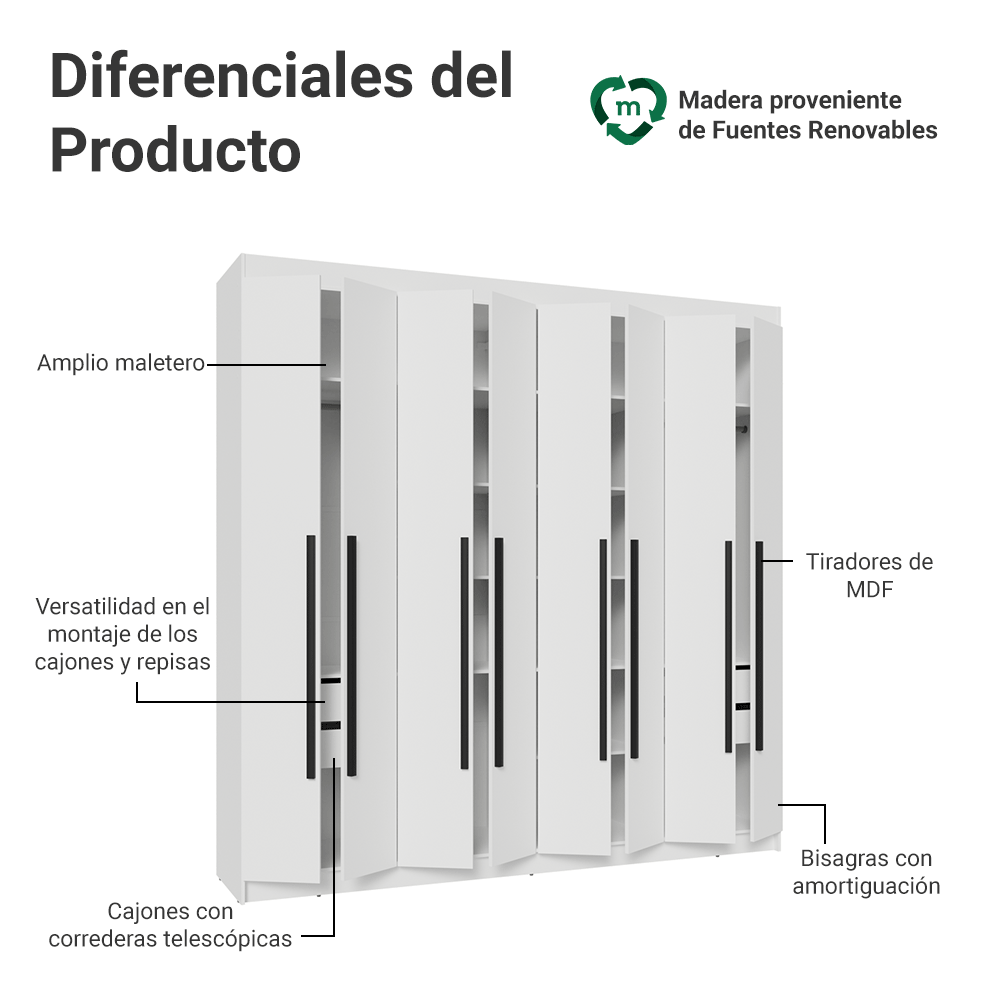 Esta combinación de elementos hace del clóset Venus 8 Puertas la elección ideal para quienes buscan un mueble funcional, con detalles que marcan la diferencia.