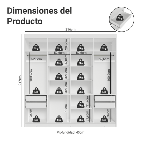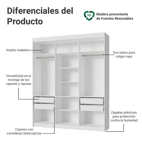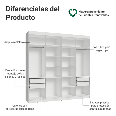Clóset Soltero 2 Puertas Corredizas con Espejo 4 Cajone...