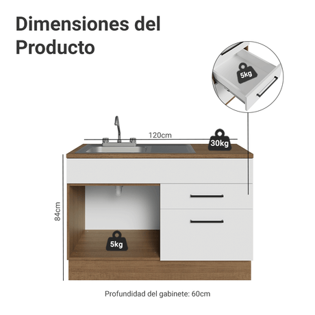Gabinete Bajo para Tarja 120 x 60 cm 1 Puerta 2 Cajones...