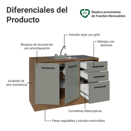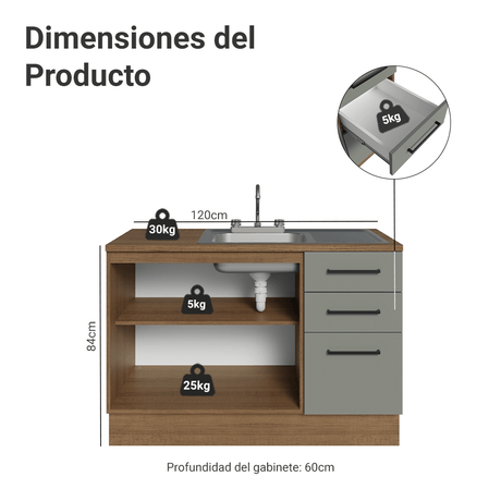 9x de $ 905.44 sin intereses15% OFF$ 8,14900$ 9,64700Precio unitario /AgotadoGabinete Bajo de Tarja 120 x 60 cm 2 Puertas y 3 Cajone...