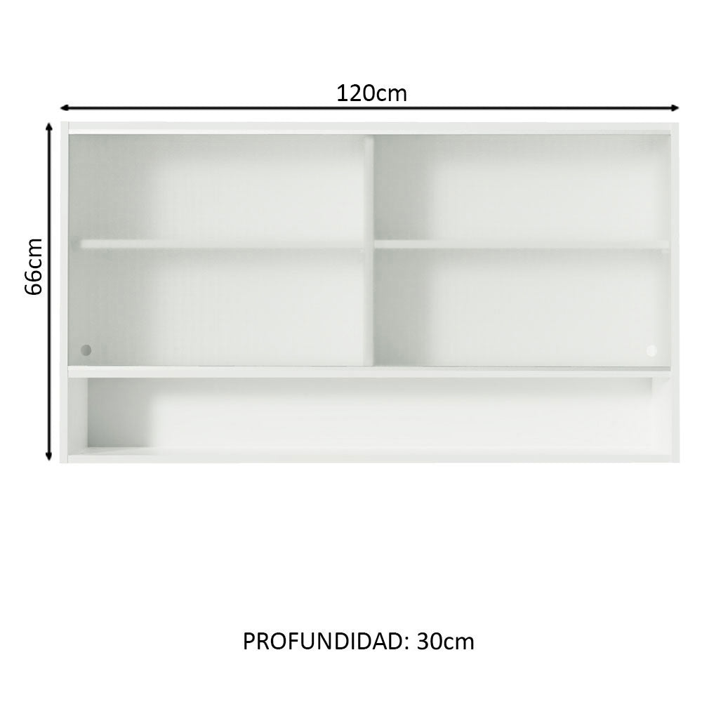 - Un (1) Gabinete Superior de 66 cm de alto x 120 cm de ancho x 30 cm de fondo con dos (2) puertas cuadradas de vidrio, dos (2) estantes interiores y un (1) nicho abierto.