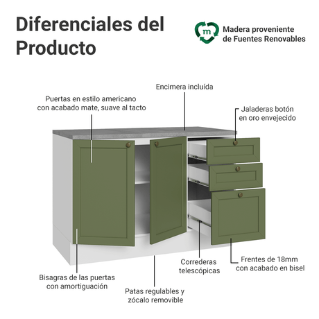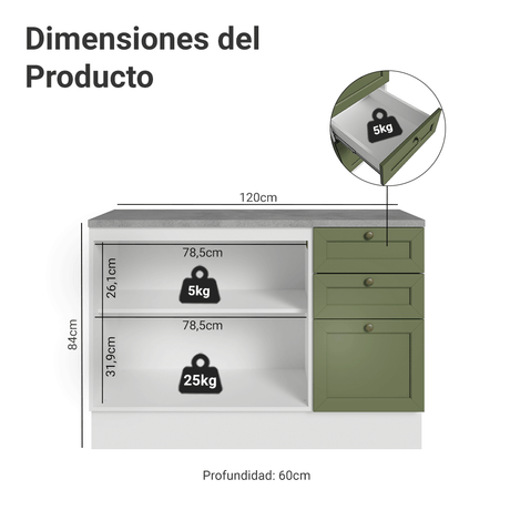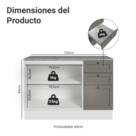 12x de $ 1,335.75 sin intereses$ 16,02900Precio unitario /AgotadoGabinete Bajo de Cocina 120 x 60 cm 2 Puertas 3 Cajones...