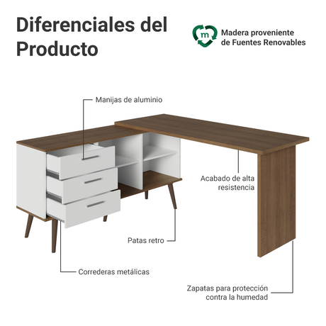 Kit 2 Piezas con Escritorio Esquinero 3 Cajones y Vitri...