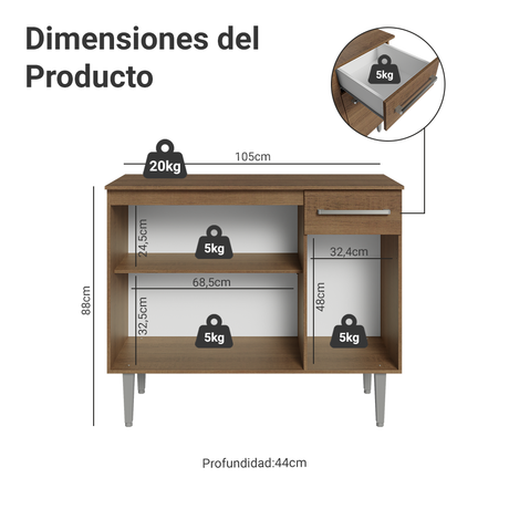 Credenza Bufetera 105cm 3 Puertas 1 Cajón Marrón
