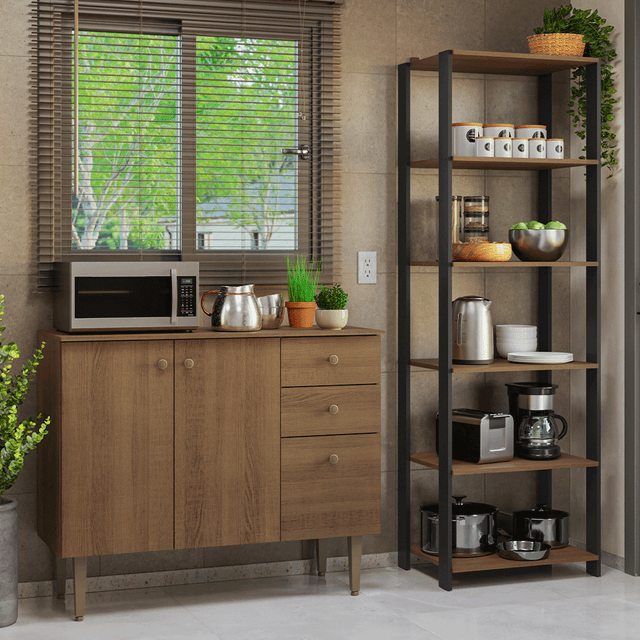 Kit Cocina Gabinete Bajo 3 Puertas 2 Cajones y Estante Despensero 5 Niveles Marrón/Negro